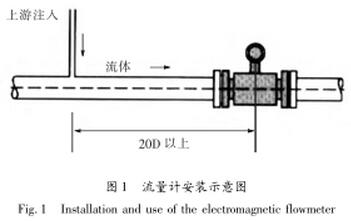 流量計安裝位置上下游直管段一般遵循前十后五原則,要求前直管段不小于10D,后直管段不小于5D;若在上游管段處有其他化學物質注入的情況下,極易導致電導率的不均勻性,流量計應盡量遠離主入口至少20D處(如圖1);若污水流量計上下游采用異徑管時,異徑管中心錐角α應小于15°(如圖2)。