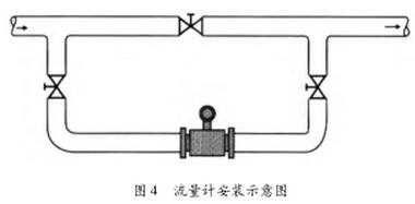 (6)安裝在工藝不允許流量中斷的管道時,應考慮儀表的清洗和維護,應安裝旁通管道(如圖4)。