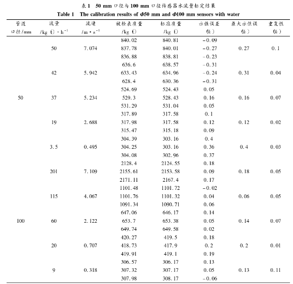 由標(biāo)定結(jié)果可知,所研制的化工污水流量計(jì)系統(tǒng)針對(duì)50mm口徑的水流量標(biāo)定示值誤差小于0.41%,重復(fù)性誤差小于0.11%。針對(duì)100mm口徑的水流量標(biāo)定示值誤差小于0.21%,重復(fù)性誤差小于0.12%。據(jù)此可知,所研制的化工污水流量計(jì)系統(tǒng)針對(duì)50mm與100mm口徑的水流量標(biāo)定精度均優(yōu)于0.5級(jí)。