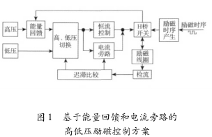 基于能量回饋和電流旁路的高低壓勵(lì)磁控制方案框圖如圖1所示,主要由高、低壓電源、能量回饋電路、高、低壓切換電路、恒流控制電路、電流旁路電路、H橋開關(guān)電路、檢流電路和勵(lì)磁時(shí)序產(chǎn)生電路組成。