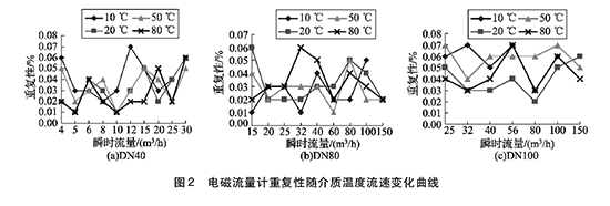 將實驗測得的給排水流量計在不同溫度及流速下的重復性數據整理,特性曲線如圖2所示,3組曲線分別對應DN40, DN80, DN100的3塊給排水流量計的重復性曲線。