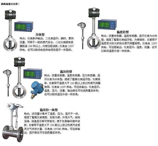 渦街流量計與現(xiàn)場顯示儀組合后,成為智能一體化流量計,分別用于飽和蒸汽流量計量、過熱蒸汽流量計量、各種化學(xué)氣體流量計量和各種液體流量計量。