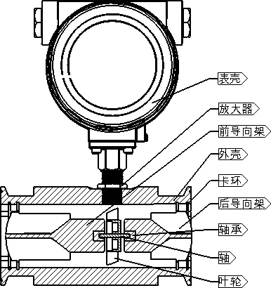 圖所示為渦輪流量傳感器結(jié)構(gòu)簡圖,由圖可見,當(dāng)被測流體流過傳感器時,在流體作用下,葉輪受力旋轉(zhuǎn),其轉(zhuǎn)速與管道平均流速成正比,葉輪的轉(zhuǎn)動周期地改變磁電轉(zhuǎn)換器的磁阻值。檢測線圈中的磁通隨之發(fā)生周期性變化,產(chǎn)生周期性的感應(yīng)電勢,即電脈沖信號,經(jīng)放大器放大后,送至顯示儀表顯示。
