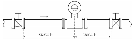 工業鹽水流量計的安裝質量對其測量結果的影響較大,因此在安裝時需要注意幾個問題。*先,工業鹽水流量計直管段的選擇在配管時一定要按照要求進行選擇,一般選擇流量計通徑與工藝管道通徑相同,即可滿足工程需要,而且安裝方便、壓力損失小,流量計直管段上游側的長度不少于5倍工藝管道直徑,下游側的長度不少于3倍工藝管道直徑(圖2)。但在流速太慢而又要求精度較高或需要變徑的應用場合,可選擇通徑小于工藝管道通徑的流量計,以提高測量精度,此時流量計上、下游必須加裝異徑管,且進口異徑管上游側應有長于10倍工藝管道直徑的直管段,下游側應有長于5倍工藝管道直徑的直管段(圖3)。