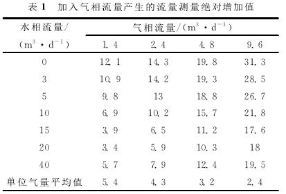 利用清水中渦輪的刻度方程計算加入不同氣體流量后渦輪響應頻率所對應的流量,即為加入氣體后的測量流量,再用所得測量流量減去配比的標準水流量,得到氣相加入后測量的絕對增加值,即加入氣相流量產生的測量誤差(見表1)。計算結果表明,加入氣體流量后,渦輪的測量流量明顯增加,尤其是液相流量較低時,增加的測量流量更高,氣體對流量測量產生了較大的測量誤差。低氣量下,平均1m3/d的氣量產生的測量誤差大約相當于5m3/d(絕對增加值)。