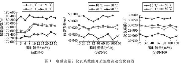 將實驗測得的環(huán)保污水專用流量計在不同溫度及流速下的儀表系數(shù)數(shù)據(jù)整理,特性曲線如圖1所示,3組曲線分別對應DN40、DN80、DN100的3塊環(huán)保污水專用流量計的儀表系數(shù)曲線。