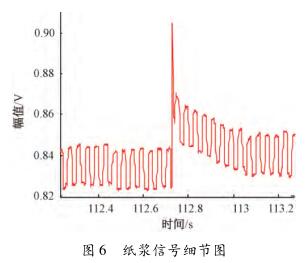 為了進(jìn)一步研究水煤漿信號的特點(diǎn),將其與紙漿信號進(jìn)行對比。通過分析課題組采集的25Hz矩形波勵(lì)磁下的紙漿信號發(fā)現(xiàn),在同樣流速下,測量介質(zhì)為紙漿時(shí),傳感器輸出信號經(jīng)調(diào)理放大后能明顯看到與流量相關(guān)的感應(yīng)電動勢信號,且其漿液干擾僅為數(shù)十毫伏,要遠(yuǎn)小于水煤漿信號中的漿液干擾,如圖5所示。對圖5所示的紙漿信號進(jìn)行局部放大,得到如圖6所示的信號。可見,紙漿信號中的漿液干擾持續(xù)的時(shí)間也遠(yuǎn)小于水煤漿信號中的漿液干擾,且頻率較低。