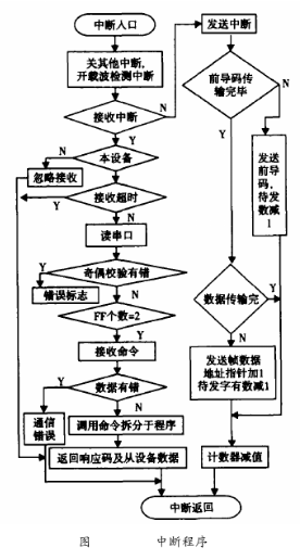 在HART通信中,雨水流量計作為從設備進行通訊,所以這里的軟件設計只是針對于從設備。HART通信采用水平和垂直校驗的方法。當檢測到接收數據有差錯時,則等到主設備命令幀發完后,通知主設備數據接收有誤。主設備則重新發命令幀,從而保證通信的準確可靠。HART中斷子程序流程圖如圖6所示。由于HART通信為主從方式,HART幀中每個字節在物理層傳輸需要9ms左右,為了保證通訊的實時性,通訊程序采用串行口終端接收/發送。該中斷所要完成通信中的主要任務,即接收和發送幀,幀的拆分和打包。