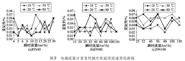 將實(shí)驗(yàn)測得的dn150深井水流量計(jì)在不同溫度及流速下的重復(fù)性數(shù)據(jù)整理,特性曲線如圖2所示,3組曲線分別對應(yīng)DN40、DN80、DN100的3塊dn150深井水流量計(jì)的重復(fù)性曲線。