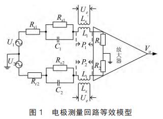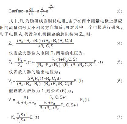 提出在硬件電路上加入模擬開關, 干擾尖峰到來時斷開模擬開關避免干擾進入后級電路,尖峰過去重新打開模擬開關;K.Saito 等提出漂移校正法,先以高勵磁頻率進行勵磁,在勵磁過程中插入低勵磁頻率提取用于漂移校正的非固定微分噪聲分量,但在插入的低勵磁頻率段漿液噪聲較大且很難將漿液噪聲與流量信號分離,此時的校正因子非單純的非固定噪聲分量,改進措施是長時間取平均值得到穩定因子。 傳統方法是同步采樣保持法,即在磁場穩定階段采樣。 其他消除干擾的方法有設置干擾補償機構、控制勵磁電流變化率減小干擾幅值、矩形波代替梯形波、希爾伯特黃變換結合傅里葉變換和程控增益技術等。經上述對現有的文獻分析與總結可知, 當前消除微分噪聲主要從信號處理方面入手,并未對影響噪聲的因素加以研究。 本文建立電極測量回路等效模型,給出仿真模型搭建、參數取值和仿真結果分析。