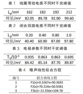 仿真試驗中,設定線圈等效電感取值范圍為 162~212mH,間隔 10mH;閉合回路等效電感范圍 0.2~1mH,間隔為 0.2mH;雙電層電容、接觸電阻隨流體電導率變化而變化,電導率增大接觸電阻和雙電層電容減小而電荷傳遞電阻增大。可設定電極接觸電阻、雙電層電容和電荷傳遞電阻范圍分別為 5~15kΩ、10~20μF 和50~60Ω,由公式(7)知,可用 T2 表示上述三者關系。 仿真參數取值不同情況下,通過 MATLAB 工具箱對仿真測量得到的干擾峰值進行曲線擬合畫出相應的曲線圖。 其中仿真數據和相對應的曲線方程如表 1~表 4 所示,曲線圖如圖 4~圖 6。