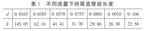 3.直管段長度和成品油流量計精度的初步預測在工程設計中,根據流體性質、流量和雷諾數確定α和d值。這樣,按照式(5)就可以依不同的流量計精度要求,對直管段長度進行初步預測,或確定直管段長度后,對流量計的精度做初步預測。當δ= 0.2%時,不同流量下所需直管段長度見表1。