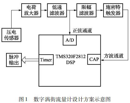 本文設計的基于 TMS320F2812 DSP 的數字二氧化碳流量計的信號處理系統由前置放大電路和數字信號處理電路兩部分組成。本文選用的前置放大電路即為目前被廣泛應用的普通二氧化碳流量計的前置放大電路,主要由電荷放大電路、低通濾波電路、限幅濾波電路和施密特觸發(fā)電路組成; 對于經壓電傳感器測得的渦街信號采用了頻域分析和時域分析相結合的方式,即由前置放大電路和數字信號處理電路相配合。時域分析通道利用 DSP 事件管理器的捕獲模塊,對前置放大電路輸出的方波進行頻率計算,然后再由 DSP 事件管理器通用定時器的比較輸出模塊進行脈沖輸出。頻域分析通道即 DSP對低通濾波電路輸出的疊加了許多噪聲的正弦信號進行 A/D 采樣,再利用 DSP 對 A/D 采樣的結果進行頻譜分析,從而得出此時渦街信號的頻率,*后由 DSP 通用定時器的比較輸出模塊進行脈沖輸出。系統設計方案示意圖如圖 1 所示。