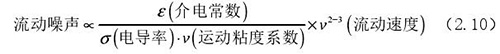 流動噪聲主要出現在低電導率流體的檢測中,由輸出端輸出的直流極化電壓時常出現左右擺動的現象,而此種擺動的電壓被稱為流動噪聲。上式(2.5)中可以觀察了解到流體電導率和流動噪聲呈現出負相關關系,由此可以了解到在進行低電導率的計算中需要重點考慮位移電流。
