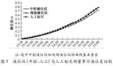 由圖 1 可知,人工標(biāo)尺測(cè)得的液位差值與現(xiàn)場(chǎng)液位儀基本吻合,其變化一致,但中控液位儀顯示的數(shù)據(jù)呈現(xiàn)一定的滯后性,這同信號(hào)的傳輸距離與解析方式相關(guān)。在日后的測(cè)量過(guò)程中,對(duì)于吸水井和清水池這些對(duì)測(cè)量結(jié)果影響較大的地方,需進(jìn)行人工標(biāo)尺讀數(shù),或?qū)x表校驗(yàn)后進(jìn)行現(xiàn)場(chǎng)讀數(shù)記錄。