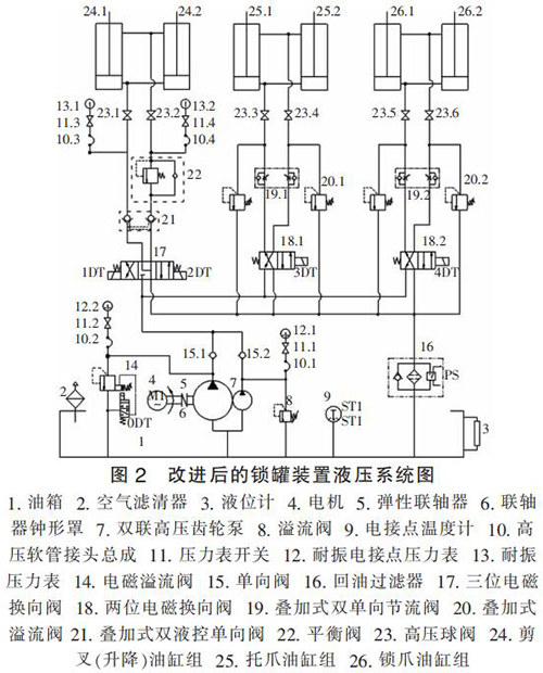 氪氣流量計(jì)原液壓系統(tǒng)圖如圖 1 所示。 通過分析圖 1 發(fā)現(xiàn),原液壓系統(tǒng)中剪叉油缸組、托爪油缸組及鎖爪油缸組并聯(lián)安裝,并均由齒輪泵供油,該系統(tǒng)設(shè)計(jì)簡單,液壓元件選擇不夠合理,工作效率低,電機(jī)發(fā)熱大,主要存在的問題:
