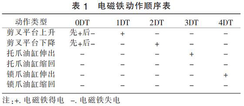 改進(jìn)后液壓系統(tǒng)工作原理:通過溢流閥調(diào)整剪叉油缸工況所需壓力,通過疊加溢流閥來調(diào)整托爪和鎖爪工況所需壓力。 剪叉平臺上升(剪叉油缸縮回)或下降(剪叉油缸伸出)時(shí) 0DT 先得電,當(dāng)剪叉油缸到位后 0DT 失電,大泵供油無壓流回油箱。 通過電磁換向閥 17(1DT 和 2DT 的得失電)來控制剪叉油缸的伸出或縮回,通過電磁換向閥 18(3DT 和4DT 的得失電)來控制托爪和鎖爪的伸出和縮回。改進(jìn)后液壓系統(tǒng)的電磁鐵動(dòng)作順序如表 1 所示。