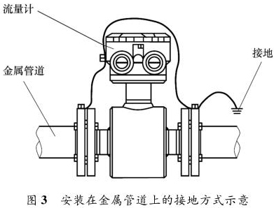 防腐型電磁流量計安裝在金屬管道上,安裝時將金屬管道與防腐型電磁流量計相連接,接地線再接入接地網,如圖 3 所示。