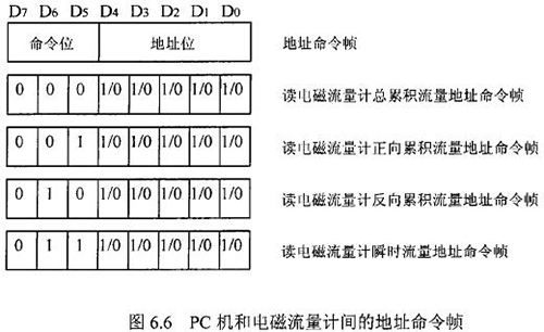 由于RS一485電氣標準規定每段只能聯結犯個節點設備,因此可用地址幀中五個二進制位表示這32個地址,其余3位用來表示命令,從而構成地址命令幀。對于控制命令需求不超過八個的通信系統,采用地址命令幀可壓縮報文長度提高通信效率。在污水網絡監控系統中,插入式電磁流量計和PC機通信的主要目的是將流量計中的有用數據讀到PC機中。這些數據包括:總累積流量、正向累積流量、反向累積流量、瞬時流量。通信時,PC機只需向插入式電磁流量計發送讀總累積流量、讀正向累積流量、讀反向累積流量、讀瞬時流量命令即可,因此二者間通信所用的地址幀和命令幀可合二為一,用一個地址命令幀代替。PC機和插入式電磁流量計間的地址命令幀定義如圖.66所示。根據污水網絡監控系統中PC機與插入式電磁流量計間通信的特殊性,二者通信所使用的報文可簡化為圖.67的格式。