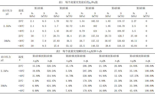 為了深入研究溫度及流量突變對高溫液體流量計響應速度的影響趨勢,把每個流量突變點前后的出口壓力p2,流量q列表如表1所示。