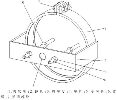 固定架是以金屬板料為主體加工而成的半開環(huán),環(huán)開口處設(shè)置緊固螺栓,環(huán)內(nèi)外均設(shè)置卡環(huán)。擋板是由一定厚度的金屬板加工而成的U形構(gòu)件,焊接于固定環(huán)兩側(cè),擋板中間設(shè)置了一個導(dǎo)向孔,導(dǎo)向孔兩側(cè)各有一個安裝銅螺母的通孔。螺桿由較高強(qiáng)度的金屬棒料加工而成,其一端螺紋與閥蓋螺孔的螺紋一致,用于連接閥蓋上的螺孔,并設(shè)有背帽防止螺桿脫離閥蓋;中段及另一端的螺紋均為梯形螺紋,與銅螺母的螺紋一致。