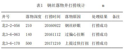 表1為一體式渦街流量計打撈統計表,可以看出自2016年9月開始即在現場進行了應用。為了展示試驗成果的普遍性,分別從不同注入方式、不同落物深度、不同落物原因的角度,共應用3口鋼絲落物井,打撈成功為100%。
