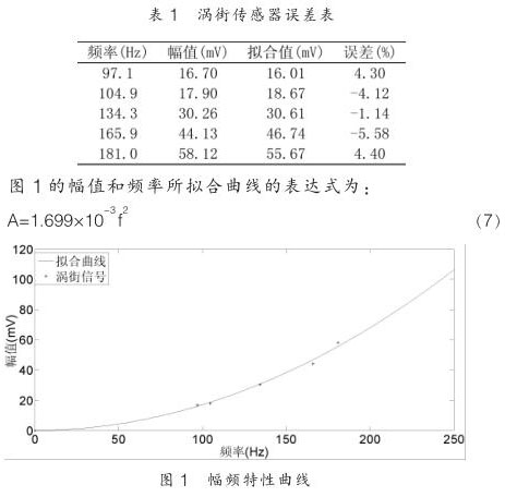 其中 K 1 為儀表系數(shù), D 為管道直徑。在管道口徑 D 不變,流體密度不變的情況下,渦街傳感器的輸出幅值與 f 2 成正比,具體表達(dá)形式可以根據(jù)實(shí)驗測出。本文以 50mm 口徑氣體實(shí)驗為例,數(shù)據(jù)如表 1 所示: