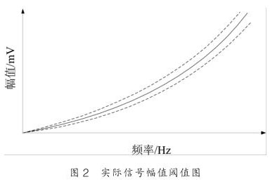 其中 c 為系數(shù), δ 為相對誤差限, 其示意圖如圖 2 所示,圖中實(shí)線為幅頻關(guān)系的理論擬合曲線, 而虛線為幅值波動的閾值曲線。根據(jù)實(shí)驗的數(shù)據(jù),渦街信號幅值波動的相對誤差為 ±10% 。