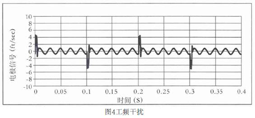 工頻干擾是硫酸管道流量計常見的干擾源。當流量計處于電源形成電磁場中時,由于分布電容的存在,以電磁波的輻射形式干擾電極信號,或者是由供電電源引入的工頻串擾,工作現(xiàn)場的工頻共模干擾,其產(chǎn)生的物理機理均是電磁感應(yīng)原理。幅度與流量信號相比,往往要大幾個數(shù)量級,頻率與供電電源頻率相同。如圖4所示,線圈驅(qū)動頻率為5Hz的電極信號,被耦合了50Hz的工頻干擾,幅度大概相當于1feet/s。