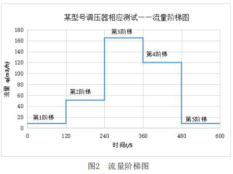 該測試主要利用實驗室測試條件,模擬客戶現場使用情況。其主要測試內容包括:測試電磁流量計在+23℃,-30℃和-40℃三種溫度下,電磁流量計出口壓力分別在2.1kPa和30kPa時,流量分別從*1階梯到*5階梯時的響應速度,客戶所提供的流量階梯如圖2所示。橫軸表示下游球閥開啟動作時間,縱軸表示衛生級電磁流量計下游需要的流量q。