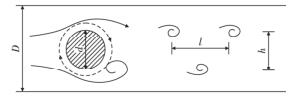 渦街氣體流量計是由漩渦發生體、頻率檢測器和信號轉換器等環節組成,輸出 4 ~ 20 mADC 信號或脈沖電壓信號。其測量原理是在流動的流體中的垂直流動方向安放 1 根或多根非流體型阻流體,在一定的流量范圍內,流體在阻流體兩側交替地分離、釋放出 2 串頻率正比于管道內的平均流速、規則的、不對稱有規律的交替漩渦列,如圖 1 所示,且兩側漩渦旋轉方向相反 。采用檢測元件測出漩渦頻率就可以推算出流體的流量。