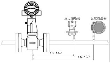 渦街氣體流量計的口徑如果與工藝管道相同,不能滿足流量儀表要求時,或者在此流速下測量準確度不能保證時,需要縮小儀表口徑,從而提高管內流速,保證測量精度。上下游必須有足夠的直管段,若傳感器安裝點的上游在同一平面上有 2 個 90°彎頭時,上游直管段≥25D,下游直管段≥5D。根據測量的需要,需在渦街氣體流量計附近測量壓力和溫度時,測壓點應在傳感器下游的(3 ~5)D 處,測溫點應在傳感器下游的(6 ~8)D 處,如圖 3 所示。