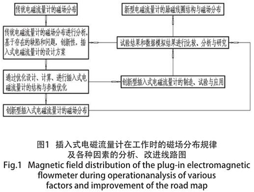 測水流量計因其特殊的結構形式,致使其抗干擾能力較弱、準確度偏低以及瞬時流量波動過大等不良現象,但便于安裝、造價低廉、普遍應用于大管道等特點而存在。為了發揮其優勢,消除其不利因素,對其內部結構及其相關技術參數進行優化設計,從而使其準確度能夠達到 ±1% FS,使抗干擾能力得到極大地增強。本文主要通過優化設計、選擇材料和試驗,使測水流量計的穩定性和準確度大幅度提高,并提出解決措施,對實際應用具有參考價值。分析與研究程序圖如圖 1 所示。