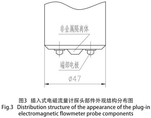 通過大量的試驗,對探頭端部外型結構亦采用特殊設計,從而消除兩個電極之間的擾流現象,同時亦消除因通電產生磁場,導致兩個電極吸附介質中的鐵屑而影響測量精度和死區效應,增強了輸出信號的穩定性,從而提高傳感器準確度和抗干擾性。通過結構的優化設計,使用壽命更長,測水流量計探頭局部,如圖 3 所示。