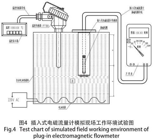 其原因是:勵磁線圈的阻值及匝數是按照常溫狀態下進行設計的,而含有勵磁線圈的測水流量計經常是高于常溫狀態下進行安裝、使用(如:高爐回水、供熱管道等),勵磁線圈的阻值隨使用環境溫度的變化而變化,致使測水流量計測量時的準確度大為降低,性能的不確定性大為增加,為了保證儀表的高準確度和穩定性,在不同的季節(主要是環境溫度和介質溫度),經過大量模擬現場實際情況的試驗,并結合轉換器的技術參數要求,得出一個完善的勵磁線圈各種技術參數。模擬現場試驗裝置如圖 4 所示。