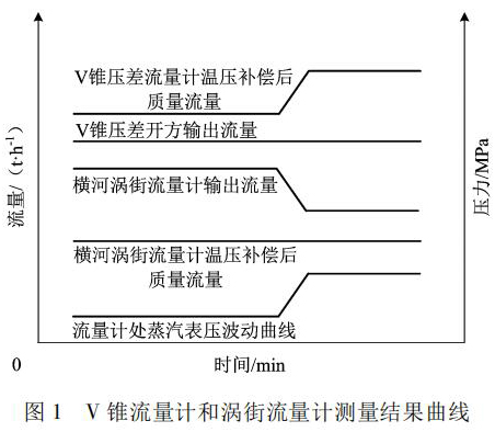 根據物料平衡反復研究,渦街流量計測量的質量流量動態曲線比較客觀反映了蒸汽流量的變化; 而 V 錐流量計測量的質量流量偏大 5%。說明該差壓流量計元件沒能產生和實際流量變化對應的差壓。