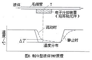 液體用tmf 在20世紀(jì)90年代初中期開(kāi)始發(fā)展并在工業(yè)生產(chǎn)中應(yīng)用,但當(dāng)前主要為微小流量?jī)x表。有消耗功率測(cè)量法的熱分布式tmf和利用珀?duì)柼? peltier)致冷元件在檢測(cè)部位致冷(即附加熱)的tmf。后者的測(cè)量原理如圖6所示,流量傳感器由測(cè)量毛細(xì)管、電子冷卻裝置(珀?duì)柼?和3各溫度檢出件組成。測(cè)量管和致冷元件接觸,無(wú)液體流動(dòng)時(shí)冷卻到某一溫度時(shí),兩者溫度相等;液體流動(dòng)時(shí)致冷元件附近測(cè)量毛細(xì)管溫度上升,如虛線(xiàn)所示分布,測(cè)量溫度檢測(cè)點(diǎn)的兩者溫度差以求的流量。