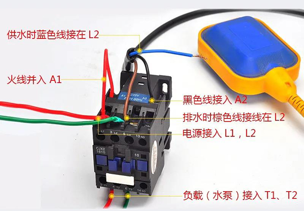 使用藍色和棕色的電線:浮球在上液位時,接點是不通的狀態。浮球在下液位時,接點是接通的狀態。