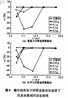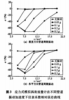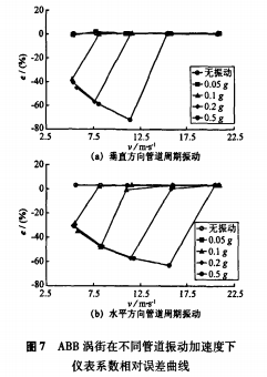 以應(yīng)力式模擬渦街流量計(jì)為被測(cè)對(duì)象,在5m/s、7.5m/s、11m/s、15.5m/s、20.5m/s流速下,分別進(jìn)行了無(wú)振動(dòng)和施加管道周期振動(dòng)的實(shí)流標(biāo)定試驗(yàn)。管道振動(dòng)方向?yàn)榇怪狈较蚝退椒较颍铀俣葹?.05-0.5g。根據(jù)試驗(yàn)數(shù)據(jù),繪制出不同管道振動(dòng)加速度下渦街儀表系數(shù)相對(duì)于無(wú)管道振動(dòng)時(shí)平均儀表系數(shù)的相對(duì)誤差曲線(xiàn),垂直方向結(jié)果如圖3(a)所示。