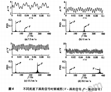 為了觀(guān)測(cè)管道周期振動(dòng)下渦街流量信號(hào)的特征,利用NI USB-6009數(shù)據(jù)采集卡對(duì)渦街正弦信號(hào)進(jìn)行采樣。以垂直方向管道振動(dòng)加速度為0.1g為例,給出了不同流速下渦街信號(hào)的時(shí)頻域圖,如圖4所示。由時(shí)域部分可知,管道振動(dòng)下渦街流量傳感器輸出的信號(hào)為真實(shí)旋渦脫落信號(hào)和管道振動(dòng)信號(hào)的合成信號(hào)。低流速(≤1lm/s)時(shí),管道振動(dòng)信號(hào)強(qiáng)、占主要成分,渦街信號(hào)疊加在其上;隨著流速變大(11~20.5m/s),渦街信號(hào)逐漸顯露出來(lái)成為主要成分、淹沒(méi)振動(dòng)信號(hào)。由頻域可知,振動(dòng)信號(hào)成分較單一,呈尖峰狀,幅值為定值,不隨流速變化而變,除40Hz基頻外還有2、3倍頻出現(xiàn);而渦街信號(hào)成分稍復(fù)雜,呈塔峰狀,幅值隨流速變大而迅速增強(qiáng),頻譜能量占總能量比重也隨流速增加而變大。