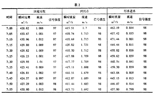 下面是隨機地從計算機中抽取的某一日的幾組數(shù)據(jù)(表2)。從表中可以看出采用超聲波流量計側量數(shù)據(jù)精確度較高,讀取數(shù)據(jù)方便,從信號強度上可以看出,在測量回流污泥時,信號強度較低,這是由于液體濁度較高,含有較大固體顆粒引起信號衰減造成的。